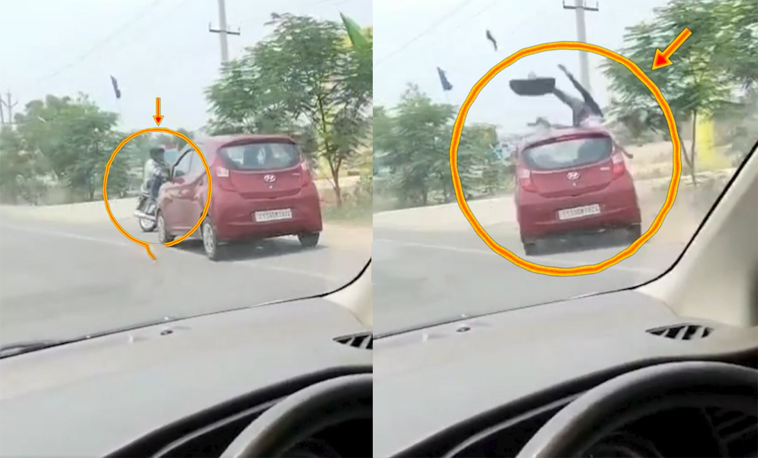 ఢీకొట్టిన కారు.. గాలిలో ఎగిరిపడిన ఇద్దరు వ్యక్తులు!