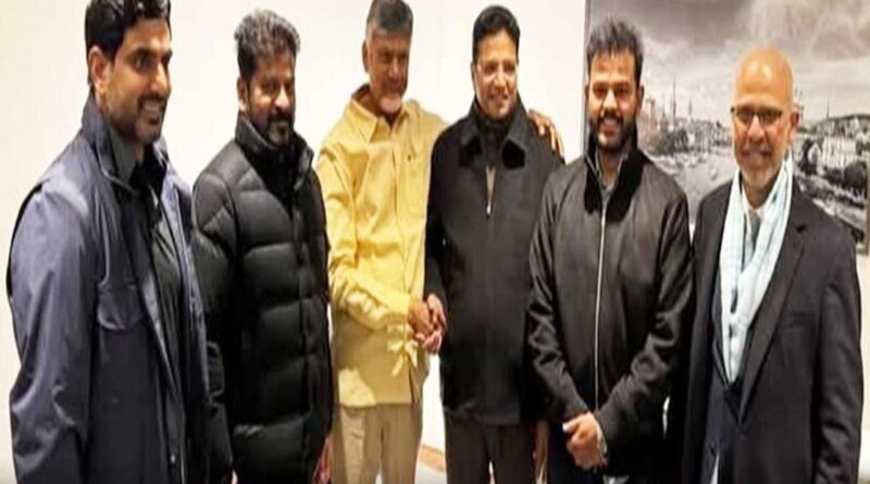 స్విట్జర్లాండ్ లోని దావోస్ లో జరుగుతున్న ప్రపంచ ఆర్థిక సదసుకు తెలుగు రాష్ట్రాల ఇద్దరు సీఎంలు చంద్రబాబు, రేవంత్ రెడ్డి హాజరయ్యారు. మంత్రులతో కలిసి దావోస్ టూర్ కు వెళ్లిన సమయంలో అరుదైన కలయిక జరిగింది. జ్యూరిచ్ చేరుకున్న ఏపీ సీఎం చంద్రబాబు, మంత్రులు, అధికారుల బృందం.. అదే ఎయిర్ పోర్టులో అప్పటికే అక్కడ ఉన్న తెలంగాణ సీఎం రేవంత్ రెడ్డి, మంత్రులు మర్యాదపూర్వకంగా కలిశారు. తెలుగు రాష్ట్రాల ఇద్దరు సీఎంలు, మంత్రులు ఒకే చోట కలిసి ఫొటోలు దిగారు. ప్రస్తుతం ఈ ఫోటోలు సోషల్ మీడియాలో హల్ చల్ చేస్తున్నాయి. ఫోటోలో తెలంగాణ సీఎం రేవంత్ రెడ్డి, ఏపీ సీఎం చంద్రబాబు, మంత్రులు లోకేష్, శ్రీథర్ బాబు, కేంద్ర విమానయాన శాఖ మంత్రి రామ్మోహన్ నాయుడు ఉన్నారు. తెలుగు రాష్ట్రాలకు పెట్టుబడులపై లక్ష్యంగా.. తెలంగాణ, ఏపీ రాష్ట్రాల ముఖ్యమంత్రులు, మంత్రులు, అధికారుల బృందం దావోస్ లో జరిగే ప్రపంచ ఆర్థిక సదస్సుకు హాజరైంది.