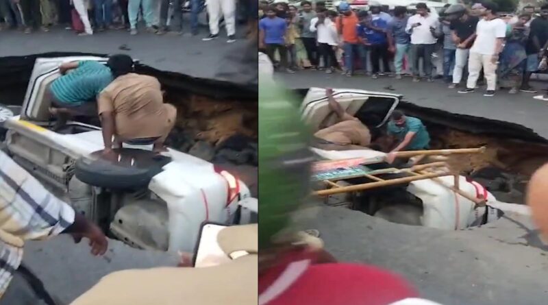 భారీ వర్షాలతో రహదారి అకస్మాత్తుగా కుంగడంతో ఓ కారు గుంతలో బోల్తా పడింది. ఈ ఘటన తమిళనాడులోని చెన్నై తిరువాన్మియూర్ టైటిల్ పార్క్ సిగ్నల్ వద్ద చోటు చేసుకుంది. కారులోని ఐదుగురిని అగ్నిమాపక సిబ్బంది రక్షించింది. వారికి స్వల్ప గాయాలవడంతో చికిత్స నిమిత్తం సమీపంలో ఉన్న ఆసుపత్రికి తరలించారు. దీంతో జాతీయ రహదారుల సంస్థ విచారణ చేపట్టింది.
