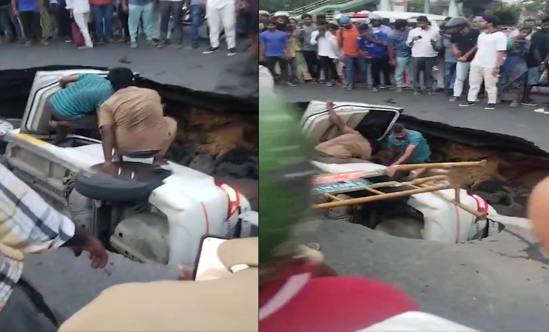 భారీ వర్షాలతో రహదారి అకస్మాత్తుగా కుంగడంతో ఓ కారు గుంతలో బోల్తా పడింది. ఈ ఘటన తమిళనాడులోని చెన్నై తిరువాన్మియూర్ టైటిల్ పార్క్ సిగ్నల్ వద్ద చోటు చేసుకుంది. కారులోని ఐదుగురిని అగ్నిమాపక సిబ్బంది రక్షించింది. వారికి స్వల్ప గాయాలవడంతో చికిత్స నిమిత్తం సమీపంలో ఉన్న ఆసుపత్రికి తరలించారు. దీంతో జాతీయ రహదారుల సంస్థ విచారణ చేపట్టింది.