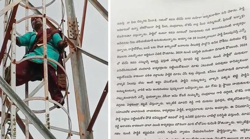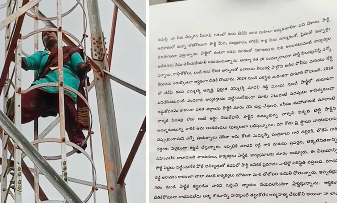 మహానాడు జరుగుతున్న వేళ టీడీపీ మహిళా నాయకురాలు చిప్పగిరి మీనాక్షి ఆత్మహత్యాయత్నానికి యత్నించింది. ఈ క్రమంలో 20 ఏళ్లుగా టీడీపీ కోసం పని చేస్తున్నా అధికారంలోకి వచ్చాక పట్టించుకవడం లేదని లేఖలో పేర్కొన్నారు. కార్యకర్తలను కడప ఎమ్మెల్యే మాధవిరెడ్డి పట్టించుకోవడం లేదంటూ వాపోయింది. అనంతరం కడప ఎన్టీఆర్ సర్కిల్ వద్ద సెల్ఫోన్ టవర్ ఎక్కి నిరసన తెలిపింది. సీఎం వస్తేనే కిందికి దిగుతా.. లేకపోతే ఇంకా పైకి వెళ్లి దూకేస్తా అంటూ బెదిరింపులకు పాల్పడింది. దీంతో భారీగా పోలీసులు, అక్కడికి చేరుకుని ఆమెను కిందకు దింపే ప్రయత్నం చేస్తున్నారు.