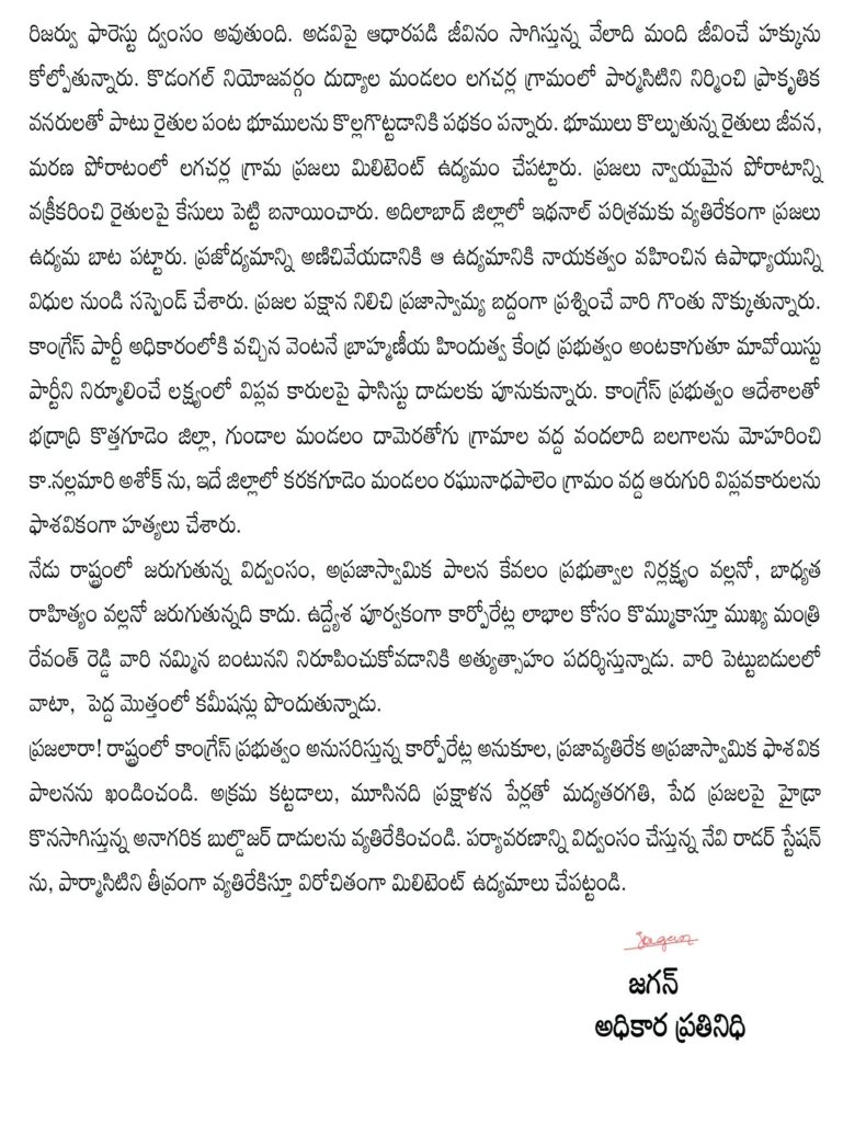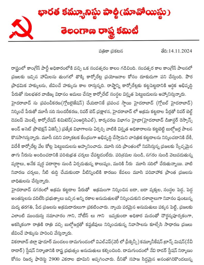 తెలంగాణలో కాంగ్రెస్ ప్రభుత్వ పాలన తీరు పట్ల మావోయిస్టులు లేఖ రిలీజ్ చేశారు. తెలంగాణలో బుల్డోజర్ పాలన కొనసాగిస్తున్నారని మావోయిస్టులు ప్రభుత్వంపై ఫైర్ అయ్యారు. తెలంగాణలో కాంగ్రెస్ అధికారంలోకి వచ్చి ఏడాది గడుస్తోందని, కానీ ప్రజలకు ఇచ్చిన హామీలను తుంగలో తొక్కి కార్పొరేట్ల ప్రయోజనాల కోసం మాత్రం దూకుడుగా పని చేస్తోందని మావోయిస్టు పార్టీ విమర్శించింది. మావోయిస్టు పార్టీ తన లేఖలో హైడ్రా, మూసీ సుందరీకరణ అంశాలను, ఇటీవల కొడంగల్ నియోజకవర్గం లగచర్లలో జరిగిన కూడా ప్రస్తావించింది. ఈ మేరకు మావోయిస్టు పార్టీ అధికార ప్రతినిధి జగన్ పేరిట లేఖ విడుదలైంది.