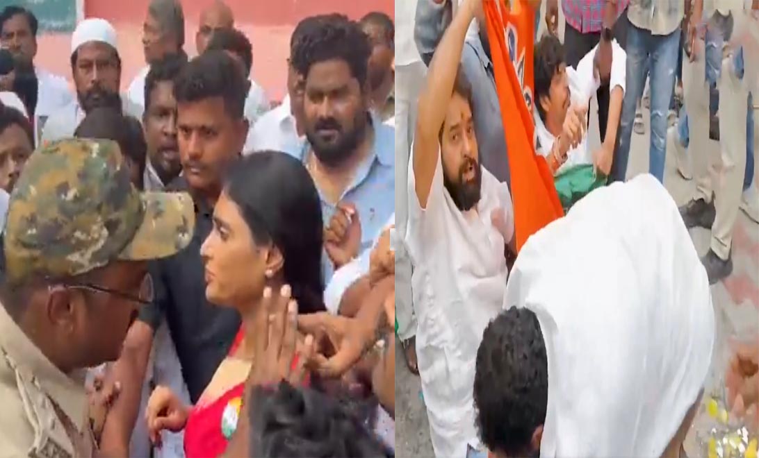 విజయవాడలోని ఆంధ్ర రత్నా భవన్ వద్ద తీవ్ర ఉద్రిక్తత నెలకొంది. కాంగ్రెస్ పార్టీ కార్యాలయంపై బీజేపీ కార్యకర్తలు కోడి గుడ్లతో దాడి చేశారు. బీజేపీ కార్యకర్తలపై చర్యలు తీసుకోవాలని ఆంధ్ర రత్నా భవన్ గేట్ వద్ద పోలీసులతో ఏపీసీసీ చీఫ్ షర్మిల వాగ్వాదం చేశారు. కాంగ్రెస్ పార్టీ కార్యాలయంపై బీజేపీ కార్యకర్తలు గుడ్లతో దాడి చేశారు. దీంతో పోలీసులు బీజేపీ కార్యకర్తలను అదుపులోకి తీసుకున్నారు.