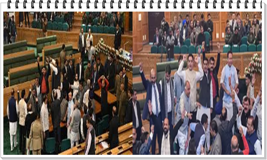 బ్యానర్లు చించేసి, కాలర్లు పట్టుకుని స్పీకర్ ఎదుటే హోరా హోరీ కొట్టుకున్నారు జమ్ముకాశ్మీర్ అసెంబ్లీలో ఎమ్మెల్యేలు. కూర్చుని సామరస్యంగా చర్చించాల్సిన అసెంబ్లీలో ఎవరూ సంయమనం పాటించలేదు. ముఖ్యమంత్రి ఒమర్ అబ్దుల్లా నిశ్శబ్దంగా ఉండిపోయారు. ఆర్టికల్ 370ని పునరుద్దరించాలంటూ డిమాండ్ చేస్తున్నారు ఎన్సీ సభ్యులు. ఏఐపీ నేత ఖుర్షీద్ ఈ విషయంపై బ్యానర్ ప్రదర్శిస్తూ ఆందోళన మొదలుపెట్టారు. దీనితో బీజేపీ నేతలు తటాలున ముందుకు వచ్చి ఆ బ్యానర్ను చించేశారు. దీనితో తీవ్ర ఉద్రిక్తతలు చోటు చేసుకున్నాయి. ఈ గందరగోళంలో స్పీకర్ అసెంబ్లీని వాయిదా వేశారు. ఆర్టికల్ 370ని పునరుద్ధించాల్సిందేనంటూ డిమాండ్ చేస్తున్నారు. దీనితో మార్షల్స్ ద్వారా వారిని బయటకు పంపించారు.