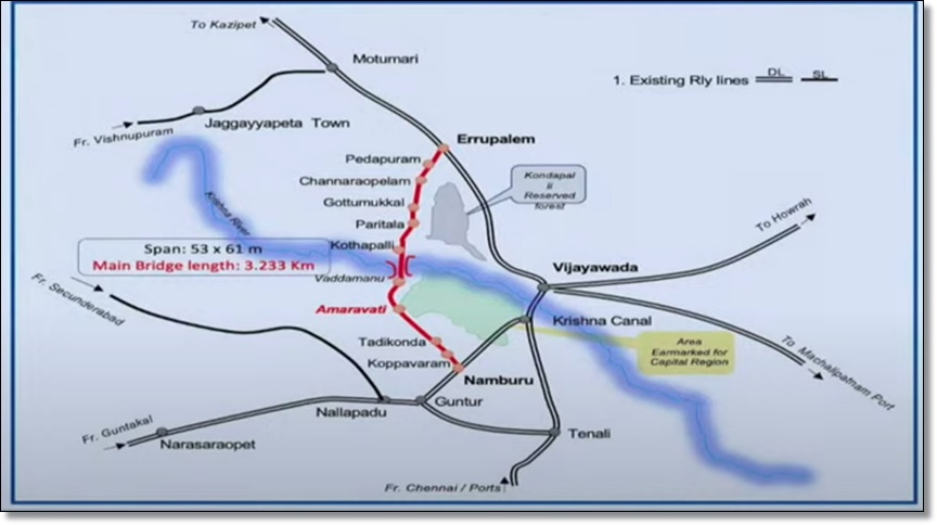 సెంట్రల్, నార్తర్న్, సదరన్ రైల్వేల నుండి ఈ మార్గాన్ని కలుపుతారు. అమరావతిలోని అమరలింగేశ్వరస్వామి దేవస్థానం, అమరావతి స్థూపం, ధ్యానబుద్ద విగ్రహం, ఉండవల్లి గుహలు కూడా ఈ రైల్వే మార్గంలో దర్శించవచ్చు. మచిలీపట్నం, కాకినాడ, కృష్ణపట్నం పోర్టులను కూడా అనుసంధానిస్తారు. కృష్ణానదిపై మూడు కిలోమీటర్ల మేర రైల్వే బ్రిడ్జి నిర్మాణం కూడా ఈ ప్రాజెక్టులో భాగంగా ఉంది. ఆంధ్ర ప్రదేశ్ రాష్ట్ర రాజధానిగా అవతరించిన అమరావతి అభివృద్ధి కోసం కేంద్రం కట్టుబడి ఉందన్నారు.