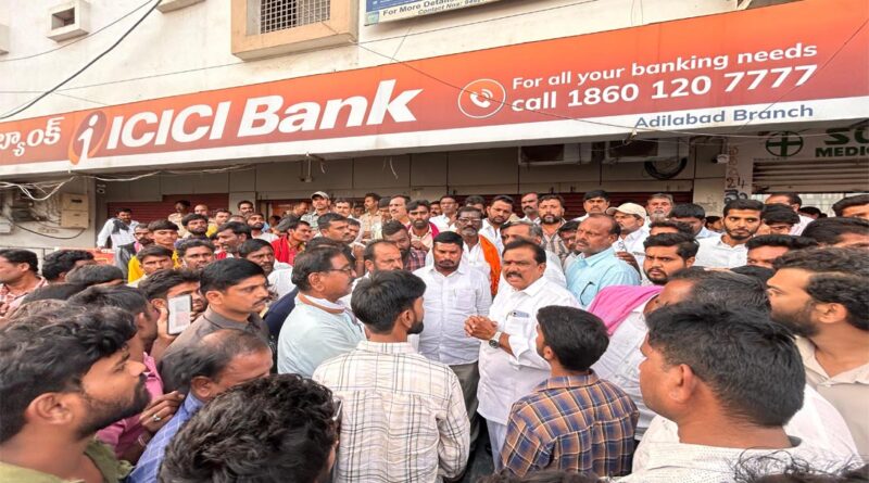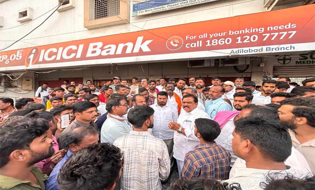 బ్యాంకర్లు పెట్టిన బాధలు భరించలేక ఓ రైతు ఆత్మహత్య చేసుకున్నాడు. బేల మండలంలోని రేణిగూడ గ్రామానికి చెందిన జాదవ్ దేవ్ రావ్ (60) శనివారం ఆదిలాబాద్ పట్టణంలోని ఐసీఐసీఐసీఐ బ్యాంకులో పురుగుల మందు తాగి ఆత్మహత్య చేసుకున్నాడు. బేల మండలానికి చెందిన వివిధ సంఘాల నాయకులు, కుటుంబ సభ్యులు బ్యాంక్ ఎదుట ఆందోళన చేపట్టారు. విషయం తెలుసుకున్న స్థానిక ఎమ్మెల్యే పాయల్ శంకర్ అక్కడికి చేరుకొని బాధిత కుటుంబ సభ్యులతో, బ్యాంక్ అధికారులతో మాట్లాడి జరిగిన ఘటనపై వివరాలను తెలుసుకున్నారు.