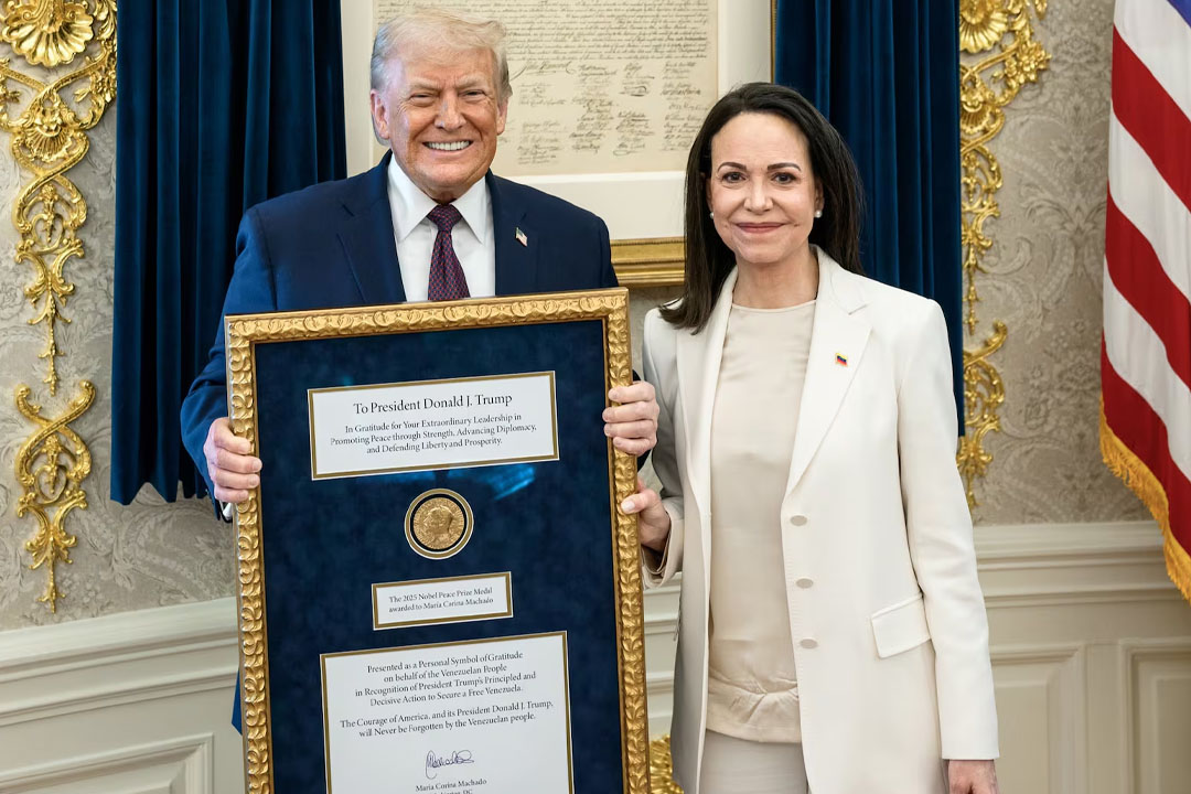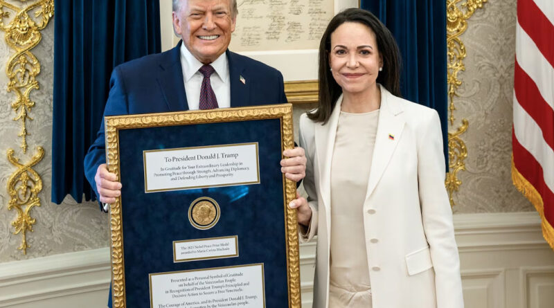 అమెరికా అధ్యక్షుడు డోనాల్డ్ ట్రంప్కు నోబెల్ శాంతి పురస్కారం అందజేశానంటూ వెనెజువెలా విపక్ష నేత మరియా కొరీనా మచాదో సంచలన ప్రకటన చేశారు. వెనెజువెలా ప్రజల స్వేచ్ఛ, భవిష్యత్తు కోసం ట్రంప్ చేసిన కృషికి గుర్తుగానే ఈ బహుమతిని వైట్ హౌస్ లో అందజేశానని ఆమె తెలిపారు. ట్రంప్ గొప్ప నాయకుడని, ప్రజలు ఆయనను నమ్మవచ్చని ఈ సందర్భంగా ఆమె కొనియాడారు. ట్రంప్ ఈ పురస్కారాన్ని అధికారికంగా స్వీకరించారా లేదా అన్నది స్పష్టత రాలేదు. నోబెల్ శాంతి పురస్కారాన్ని ఇలా ఇతరులకు బదిలీ చేయడం సాధ్యం కాదని నోబెల్ సంస్థ స్పష్టం చేసింది.