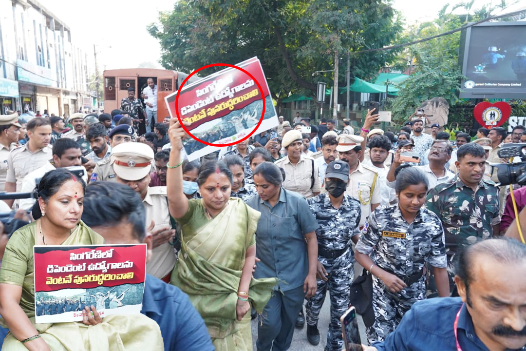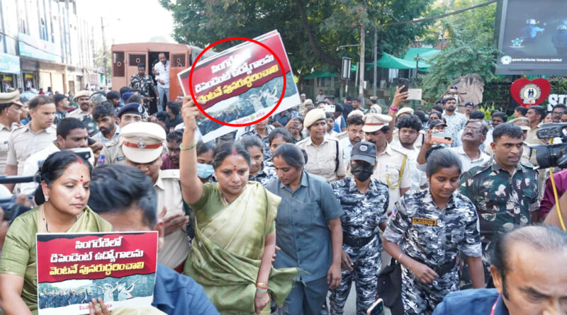 హైదరాబాద్: సింగరేణిలో డిపెండెంట్ ఉద్యోగాలను పునరుద్ధరించాలని, మెడికల్ బోర్డు వెంటనే ఏర్పాటు చేయాలని కోరుతూ లక్డీకపూల్ వద్దనున్న సింగరేణి భవన్ ముట్టడికి తెలంగాణ జాగృతి, హెచ్ఎంఎస్ యత్నించాయి. ముట్టడికి పిలుపునిచ్చిన నేపథ్యంలో హెచ్ఎంఎస్, జాగృతి కార్యకర్తలు, నాయకులను పోలీసులు ముందస్తు అరెస్టులు చేయడంతో… జాగృతి అధ్యక్షురాలు కల్వకుంట్ల కవిత కూడా ముట్టడిలో పాల్గొన్నారు. కార్యకర్తలతో కలిసి భవన్ ఎదుట ఆందోళనకు దిగిన కవితను పోలీసులు అదుపులోకి తీసుకొని నాంపల్లి స్టేషన్కు తరలించారు. కవిత వస్తోందన్న ముందస్తు సమాచారంతో పోలీసులు బందోబస్తు పెంచగా, కవిత ఆటోలో వచ్చి సింగరేణి భవన్