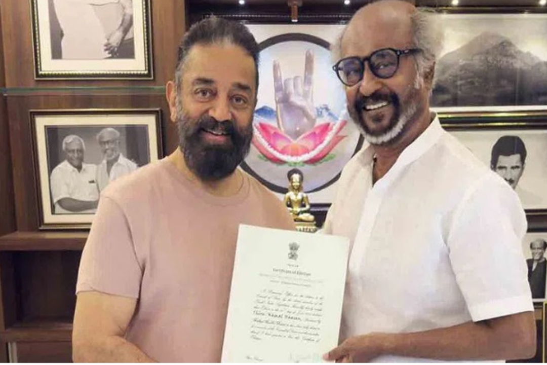 తమిళ సినీ దిగ్గజాలు కమల్ హాసన్, రజనీకాంత్ ఒకేచోట కలుసుకున్నారు. దిగ్గజనటుడు కమల్ హాసన్ రాజ్యసభ ఎంపీగా ఎన్నికైన సందర్భంగా ఈ శుభవార్తను తన స్నేహితుడితో పంచుకోవడానికి రజనీకాంత్ నివాసానికి వెళ్లారు. ఈ విషయాన్ని కమలే స్వయంగా ఎక్స్ వేదికగా ప్రకటించారు. “నా స్నేహితుడు రజనీకాంత్కు రాజ్యసభ ఎంపీగా నా కొత్త ప్రయాణం గురించి తెలియజేశాను. ఎంతో సంతోషంగా ఉంది” అని కమల్ హాసన్ ఎక్స్ వేదికగా రాసుకొచ్చాడు. దీనితో పాటు ఫొటోలను షేర్ చేశారు. ఈ ఫొటోలలో కమల్ హాసన్ తన రాజ్యసభ ఎంపీ ఆర్డర్ను రజనీకాంత్కు చూపిస్తూ ఉండగా, మరొక ఫొటోలో వారిద్దరూ ఆత్మీయంగా ఆలింగనం చేసుకున్నారు. కాగా ఇందుకు సంబంధించిన ఫొటోలు వైరల్గా మారాయి. మక్కల్ నీది మైయం పార్టీ అధినేత కమల్ హాసన్, 2024 లోక్సభ ఎన్నికల సమయంలో ద్రవిడ మున్నేట్ర కజగం (డిఎంకె) పార్టీకి మద్దతుగా నిలిచిన విషయం తెలిసిందే. ఈ ఎన్నికల ఒప్పందం ప్రకారం కమల్హాసన్ని రాజ్యసభకు నామినేట్ చేయడంతో పాటు ఏకగ్రీవంగా ఎన్నిక చేసింది డీఎంకె.