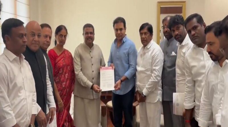 ఢిల్లీ పర్యటనలో భాగంగ బీఆర్ఎస్ వర్కింగ్ ప్రెసిడెంట్ కేటీఆర్ కేంద్రమంత్రితో భేటీ అయ్యారు. యూజీసీ నిబంధనల పై కేంద్ర విద్యా శాఖ మంత్రి ధర్మేంద్ర ప్రధాన్ కలిసి కేటీఆర్ వినతి పత్రం ఇచ్చారు. కొత్త నిబంధనల వల్ల మెడికల్ సీట్ల విషయంలో తెలంగాణకు అన్యాయం జరుగుతుందని.. నిబంధనలు సవరించి తెలంగాణ వైద్య విద్యార్థులకు న్యాయం చేయాలని విజ్ఞప్తి చేశారు. కేటీఆర్ తో పాటు మాజీ మంత్రి సబితా ఇంద్రారెడ్డి, మాజీ స్పీకర్ సురేశ్ రెడ్డి, మాజీ ఎంపీ వినోద్; మాజీ ఎమ్మెల్యే బాల్కసుమన్ బీఆర్ఎస్ పార్టీ నాయకులు కూడా ఉన్నారు.