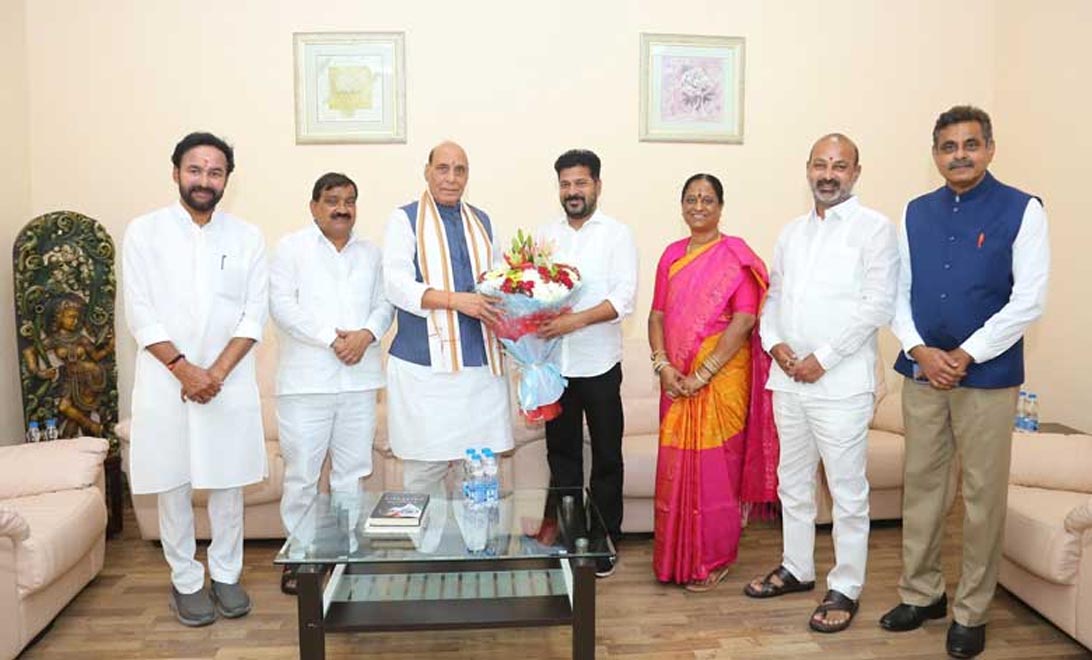 కేంద్ర రక్షణ మంత్రి రాజ్ నాథ్ సింగ్ కు సీఎం రేవంత్ రెడ్డి, కేంద్ర మంత్రులు కిషన్ రెడ్డి, బండి సంజయ్ ఘనస్వాగతం పలికారు. బేగంపేట విమానాశ్రయానికి వెళ్లిన సీఎం, కేంద్ర మంత్రులు ప్రత్యేక విమానంలో బేగంపేటకు చేరుకున్న రాజ్ నాథ్ సింగ్ కు పుష్పగుచ్ఛం అందించి, శాలువాతో సత్కరించారు. అనంతరం వాతావరణం అనుకూలించకపోవడంతో రోడ్డు మార్గాన వికారాబాద్ జిల్లా పూడూర్ మండలం దామగుండం రాడార్ కేంద్రం భూమిపూజ కార్యక్రమానికి బయల్దేరి వెళ్లారు.