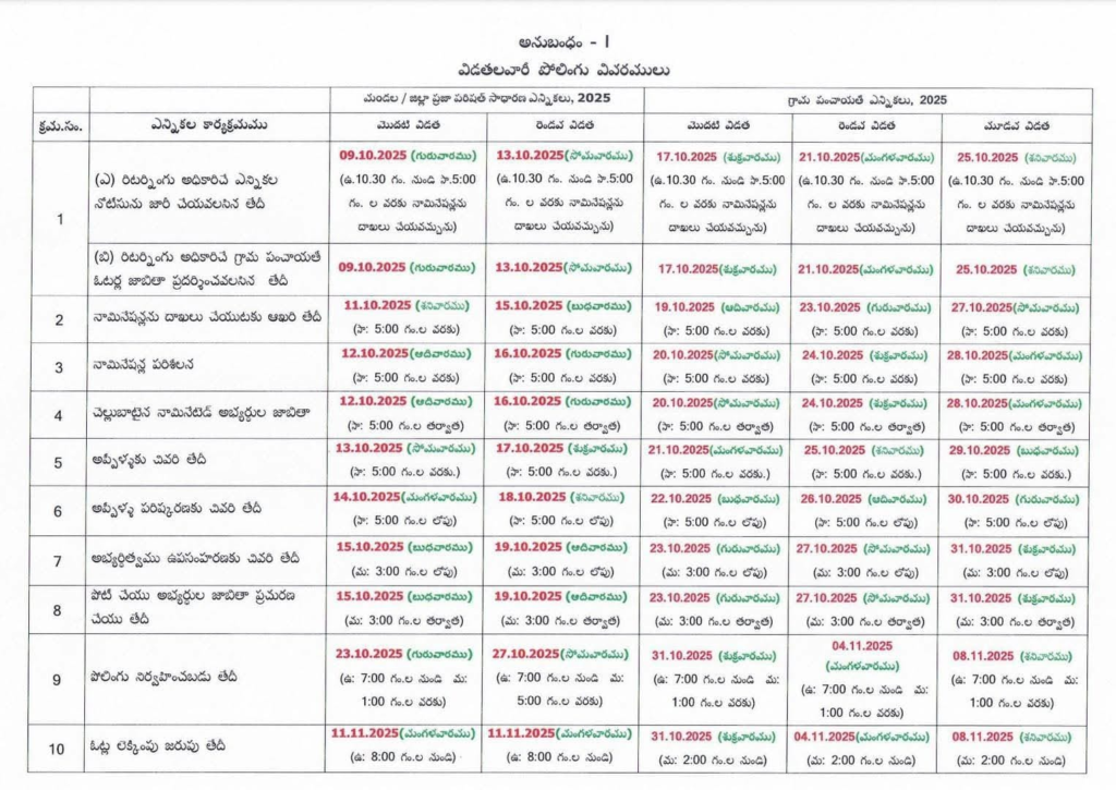 ఈ మేరకు రాష్ట్ర ఎన్నికల కమిషనర్ రాణికుముదిని షెడ్యుల్ ను వెల్లడించారు. మొదట ఎంపీటీసీ, జడ్పీటీసీ.. ఆ తర్వాత గ్రామ పంచాయతీ ఎన్నికలు నిర్వహించనున్నట్లు తెలిపారు.
