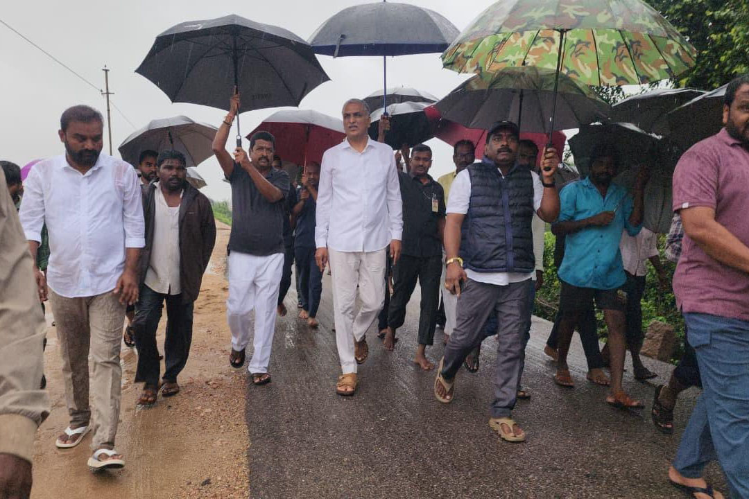 మెదక్ జిల్లా వరద ముప్పు ప్రాంతాల్లో గురువారం మాజీ మంత్రి హరీష్ రావు పర్యటించారు. రాజిపేట గ్రామంలో వరదలో గల్లంతైన ప్రాంతాలను పరిశీలించి, వరదలో ప్రాణాలు కోల్పోయిన సత్యం కుటుంబాన్ని పరామర్శించారు. ఈ సందర్భంగా ఆయన మాట్లాడుతూ, “మెదక్, కామారెడ్డి జిల్లాలు వరదలతో తీవ్రంగా ఇబ్బంది పడుతున్నా ముఖ్యమంత్రి మాత్రం మూసి సుందరీకరణ, ఆటల పోటీలపై సమీక్షలు చేస్తున్నారు. ఒక మంత్రి అయితే అత్యవసరం అయితే తప్ప హెలికాప్టర్ వాడలేమని అంటున్నారు. రాజిపేటలో ఇద్దరు వరదల్లో చిక్కుకుని కరెంట్ పోల్ ఎక్కి నాలుగైదు గంటలు సహాయం కోసం ఎదురుచూశారు. ఇది కేవలం ప్రభత్వ అసమర్ధత , నిర్లక్ష్యం అని విమర్శించారు. అలాగే, వరదలో మృతులైన రెండు కుటుంబాలకు కనీసం రూ.25 లక్షల ఆర్థిక సహాయం అందించాలనీ, వరదల కారణంగా నష్టపోయిన రైతులకు ఎకరానికి రూ.25,000 చొప్పున పంట నష్టపరిహారం ఇవ్వాలని డిమాండ్ చేశారు. ప్రభుత్వ నిర్లక్ష్యం కారణంగానే ఈ పరిస్థితి ఏర్పడిందని హరీష్ రావు అన్నారు.ప్రస్తుతం మెదక్ ముంపు ప్రాంత ప్రజలు సహాయక చర్యల కోసం ఎదురుచూస్తున్నారని, తాగునీరు లేక వర్షపు నీరు తాగాల్సిన పరిస్థితి నెలకొన్నదని, ధూప్ సింగ్ తాండా ప్రజలు కూడా సహాయం కోసం ఎదురు చూస్తున్నారని ఆందోళన వ్యక్తం చేశారు.
